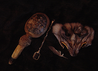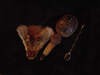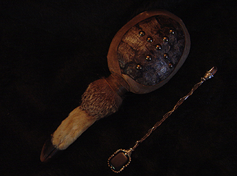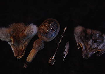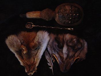 Here are some pictures of my black obsidion wand, deer handle with a turtle shell-rattle and the two fur skins of head of a gray/black fox, and brown coyote